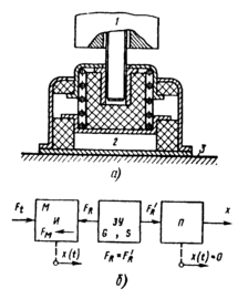 а – устройство виброизоляции (1 – источник; 2–виброизолятор; 3–приемник); б– схема системы И–ЗУ–П