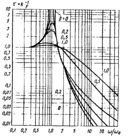 Из последнего выражения видно, что цель виброизоляции (е > 0) обеспечивается в частотном диапазоне: ω > √2ω. На рис. 6.33 представлена зависимость коэффициента передачи r от отношения частоты вынуждающей силы к собственной частоте вибросистемы при разных значениях отношения импеданса демпфирующего элемента к его критическому значению, т. е. при разных D = S/Sкр.