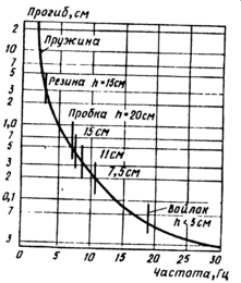 В качестве виброизоляторов используют упругие материалы и прежде всего металлические пружины, резину, пробку, войлок. Выбор того или иного материала обычно определяется величиной требуемого статического прогиба и условиями, в которых виброизолятор будет работать (например, температурой, химической агрессивностью рабочей среды и т. д.). Зависимость между статическим прогибом и собственной частотой для некоторых материалов показана на рис. 6-34.