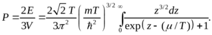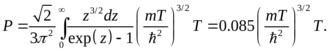 Давление не зависит от объема, так как частицы, находящиеся в состоянии с нулевой энергией (в бозе-конденсате), не имеют импульса и не вносят вклад в давление. Число частиц с ненулевой энергией определяется из второго из соотношений (4). С учетом (5) находим