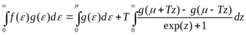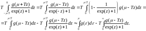 Здесь мы заменили верхний предел во втором интеграле на бесконечность, так как возникающая поправка экспоненциально мала, а мы будем учитывать только степенные поправки по температуре. Итак,