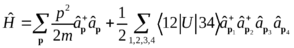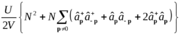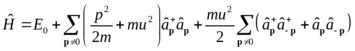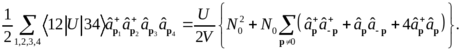 Фактор 4 возник из-за четырех возможных перестановок операторов в левой части этого выражения. Приведенные значения импульсов учитывают закон сохранения импульса. Пренебрегаем также слагаемыми во взаимодействии с меньшими степенями числа частиц