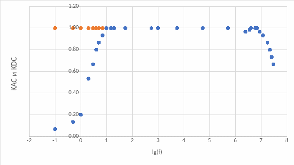Рис. 3 График зависимости коэффициентов ослабления сигнала от частоты в логарифмическом масштабе по частоте