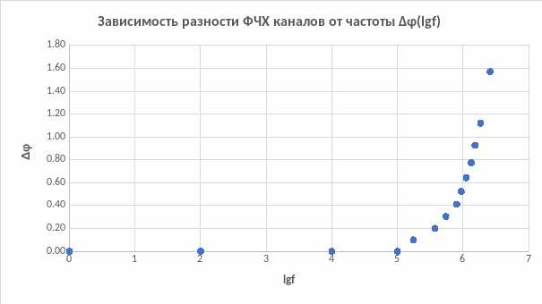 2.4.2 На основании таблицы 4 построим график зависимости разности ФЧХ каналов осциллографа от частоты в логарифмическом масштабе по частоте
