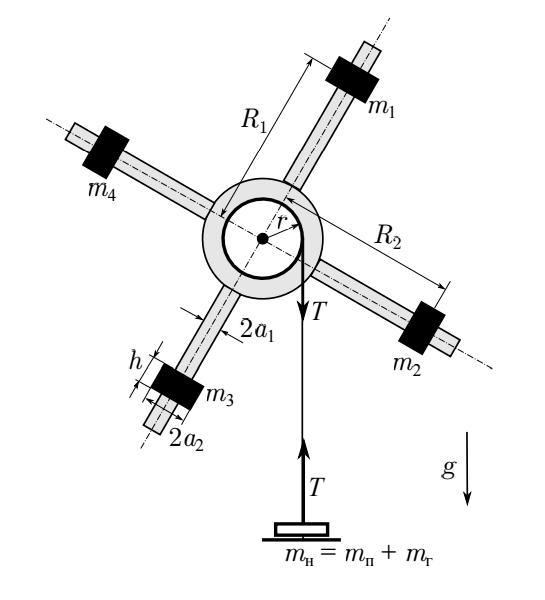 В работе используется крестообразный маятник, состоящий из четырех тонких стержней радиуса a, укрепленных на втулке под прямым углом друг к другу. Перпендикулярная рисунку ось закреплена на подшипниках, поэтому система может свободно вращаться. Момент инерции маятника можно изменять, передвигая грузики