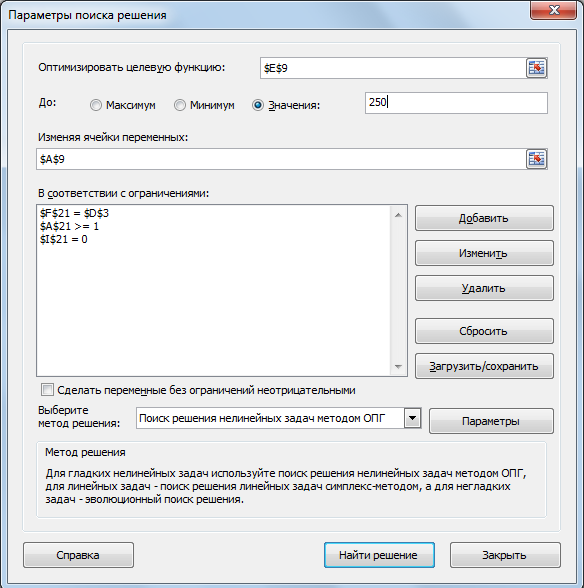 Сформулируйте задачу поиска решения так, как это показано ниже и выполните поиск. Убедитесь в том, что нужное решение было найдено сразу для всех значений радиусов матриц.