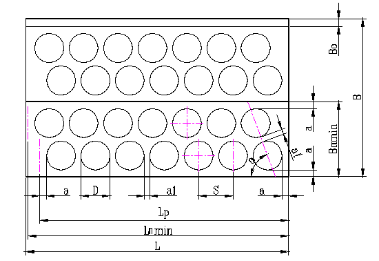 Необходимо выбрать наилучшие размеры и найти наилучший вариант раскроя листа шириной B и длиной L. Диапазон возможного изменения длин листа: L=2000…3000 мм с шагом 100 мм, диапазон возможного изменения ширины листа: В=600…1100 мм с шагом 50 мм. Предварительно выбрана схема двухрядного косого раскроя, что определяется размерами штампового пространства используемого прессового оборудования.
