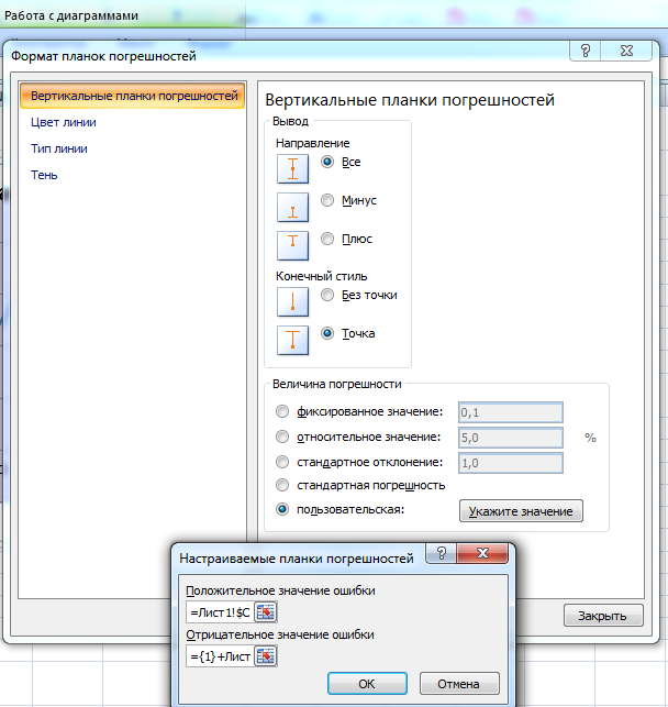 Отобразите на диаграмме погрешности вычисления. Для этого выделите кривую (она имеет название Ряд «p,МПа» ), на вкладку Макет. Затем в Анализе выбираем Планки погрешностей по стандартным ошибкам. Нажимаем правой кнопкой на полученные планки и выбираем Формат планок погрешностей в который выбераем вид показа – обе планки погрешностей. В Велечине погрешностей ставим маркер напротив значения Пользовательская величина погрешностей , в графе «+» введите диапазон положительной погрешности, вычисленной Вами =Лист1!$C$14:$K$14 (это можно сделать и мышью, выделяя соответствующий диапазон в таблице), а в графе «-»=Лист1!$C$15:$K$15