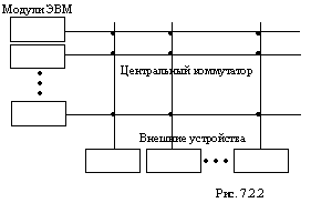 Одной из ранних структур, в которой реализован принцип перекрестной коммутации, явилась система, получившая название "полиморфная ЭВМ" (рис. 2.2). Модули ЭВМ, включающие блоки процессоров и памяти, могли осуществлять связь с периферийными устройствами через центральный коммутатор.