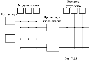 Для обеспечения большей гибкости и увеличения возможностей по расширению в системе может быть введена дополнительная коммутационная матрица устройств ввода-вывода. Такой коммутатор связывается с центральным через процессоры управления вводом-выводом (рис. 2.3), при этом устройства ввода- вывода могут подсоединяться к любому каналу. Рассмотренная структура мультипроцессорных систем используется в больших вычислительных системах фирмы "Burroughs" (США).