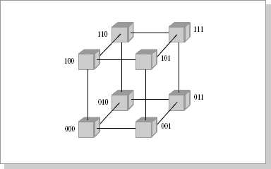 Возьмем единичный квадрат в двухмерном пространстве с вершиной в начале координат (рис. 9.3,а). Пусть его вершины соответствуют процессорным элементам (ПЭ), а ребра — связям между ними. Пусть код, образованный координатами вершин, — адрес ПЭ. Тогда видно, что связи между ПЭ существуют тогда, когда адреса отличаются не более чем в одном разряде. То же самое можно обнаружить для n = 3, n = 4 и т.д.