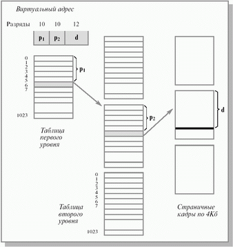Таблица, состоящая из 220 строк, разбивается на 210 таблиц второго уровня по 210 строк. Эти таблицы второго уровня объединены в общую структуру при помощи одной таблицы первого уровня, состоящей из 210 строк. 32-разрядный адрес делится на 10-разрядное поле p1, 10-разрядное поле p2 и 12-разрядное смещение d. Поле p1 указывает на нужную строку в таблице первого уровня, поле p2 – второго, а поле d локализует нужный байт внутри указанного страничного кадра. Таким образом, для размещения процесса с большим объемом занимаемой памяти достаточно иметь в оперативной памяти одну таблицу первого уровня и несколько таблиц второго уровня.
