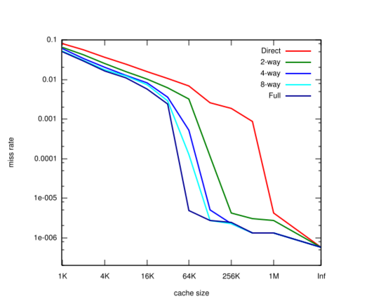 Чем ближе значение Rhit к 1, тем ближе значение Tср к Thit. Частота попаданий определяется в основном архитектурой кэш-памяти и ее объемом. На Рис.1 приведена зависимость частоты промахов от объема кэш-памяти первого уровня (L1) для архитектуры Alpha 21264. Данная зависимость была получена с помощью бенчмарка SPEC CPU2000.