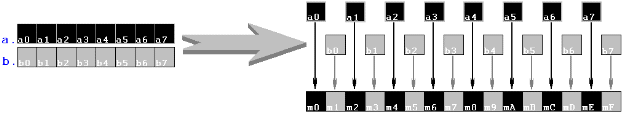 На рисунке показан пример, когда два исходных потоков (слева) сливаются в один физический поток, сконструированный по принципу чередования адресов, что фактически равносильно его расщеплению на два логических потока.