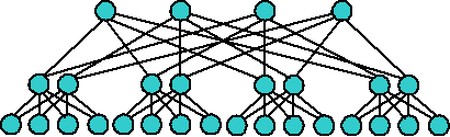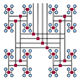 (fat tree). Архитектура "fat tree" (hypertree) предложена Лейзерсоном (Charles E. Leiserson) в 1985 году. Процессоры локализованы в листьях дерева, в то время как внутренние узлы дерева скомпонованы во внутреннюю сеть. Поддеревья могут общаться между собой, не затрагивая более высоких уровней сети. При этом каналы, соединяющие поддеревья обладают большей пропускной способностью, чем каналы, соединяющие листья (поэтому такое дерево и называют “толстым”). За счет подобной гибкости построения толстое дерево может быть эффективно адаптировано под конкретную задачу.