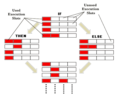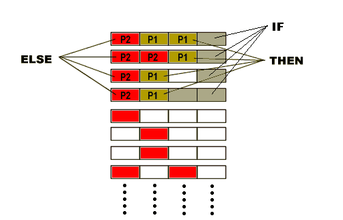 Поэтому в Intel Itanium (IA-64) был применен иной подход. При появлении условного оператора одновременно производится вычисление условия, а также выполнение обеих ветвей вычисления. При этом каждая инструкция помечается однобитовым флагом-предикатом, два значения которого соответствуют двум возможным ветвям вычислений. После вычисления условия выставляется соответствующее значения предиката, и ненужная ветвь вычислений отбрасывается. Данный процесс проиллюстрирован на рисунке: