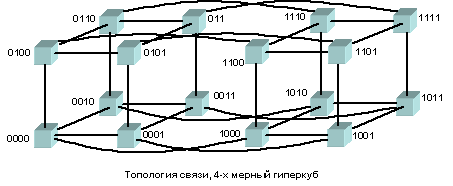 При таком типе соединения максимальное расстояние между процессорами окажется равным 6 (количество связей между процессорами, отделяющих самый ближний процессор от самого дальнего). Теория же показывает, что если в системе максимальное расстояние между процессорами больше 4, то такая система не может работать эффективно. Поэтому, при соединении 16 процессоров друг с другом плоская схема является не эффективной. Для получения более компактной конфигурации необходимо решить задачу о нахождении фигуры, имеющей максимальный объем при минимальной площади поверхности. В трехмерном пространстве таким свойством обладает шар. Но поскольку необходимо построить узловую систему, то вместо шара приходится использовать куб (если число процессоров равно 8) или гиперкуб, если число процессоров больше 8. Размерность гиперкуба будет определяться в зависимости от числа процессоров, которые необходимо соединить.