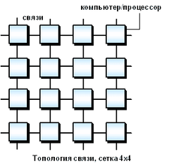 Рассмотрим для примера задачу построения симметричной 16-ти процессорной системы, в которой все процессоры были бы равноправны. Наиболее естественным представляется соединение в виде плоской решетки, где внешние концы используются для подсоединения внешних устройств.