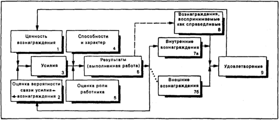 Пунктирная линия между результативностью и внешним вознаграждением означает, что может существовать связь между результативностью какого-либо сотрудника и выдаваемыми ему вознаграждениями. Дело в том, что эти вознаграждения отражают возможности вознаграждения, определяемые руководителем для данного сотрудника и организации в целом. Пунктирная линия между результативностью и вознаграждением, воспринимаемым как справедливое (8), использована для того, чтобы показать, что в соответствии с теорией справедливости, люди имеют собственную оценку степени справедливости вознаграждения, выдаваемого за те или иные результаты. Удовлетворение (9) — это результат внешних и внутренних вознаграждений с учетом их справедливости (8). Удовлетворение является мерилом того, насколько ценно вознаграждение на самом деле (1). Эта оценка будет влиять на восприятие человеком будущих ситуаций.