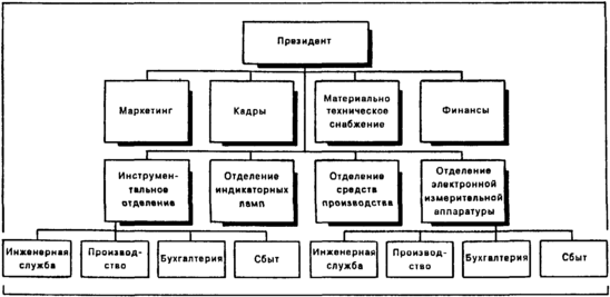 Чтобы справиться с новыми проблемами, обусловленными размером фирмы, диверсификацией, технологией и изменениями Внешней среды, руководство этих предусмотрительных фирм разработало дивизиональную организационную структуру, в соответствии с которой деление организации на элементы и блоки происходит по видам товаров или услуг, группам покупателей или географическим регионам.