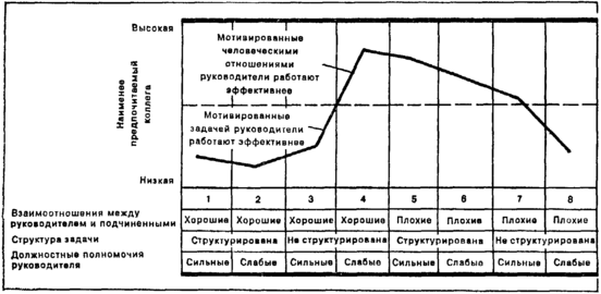 Из восьми потенциальных ситуаций первая является наиболее благоприятной для руководителя. В ней задача хорошо структурирована, должностные полномочия большие, а отношения между руководителем и подчиненными также хорошие, что создает максимальную возможность для оказания влияния. В противоположность этому, ситуация 8 — наименее благоприятная, потому что должностные полномочия невелики, отношения с подчиненными плохие и задача не структурирована. Любопытно, что результаты исследований Фидлера показывают, что самым эффективным стилем руководства в обоих этих крайних случаях будет ориентация на задачу. Эту кажущуюся непоследовательность можно объяснить с помощью логики.