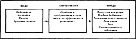 МОДЕЛЬ ОРГАНИЗАЦИИ КАК ОТКРЫТОЙ СИСТЕМЫ. Рисунок представляет собой упрощенное изображение организации как открытой системы. На входе организация получает от окружающей среды информацию, капитал, человеческие ресурсы и материалы. Эти компоненты называются входами. В процессе преобразования организация обрабатывает эти входы, преобразуя их в продукцию или услуги. Эта продукция и услуги являются выходами организации, которые она выносит в окружающую среду. Если организация управления эффективна, то в ходе процесса преобразования образуется добавочная стоимость входов. В результате появляются многие возможные дополнительные выходы, такие как прибыль, увеличение доли рынка, увеличение объема продаж (в бизнесе), реализация социальной ответственности, удовлетворение работников, рост организации и т.п.