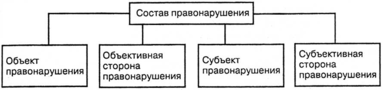 Этой цели в юридической науке и практике служит конструкция юридического состава правонарушения, представляющего совокупность необходимых и достаточных с точки зрения действующего законодательства условий или элементов (и их признаков) объективного и субъективного характера для квалификации противоправного деяния в качестве правонарушения. Элементами состава правонарушения являются (рис. 1):