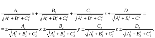 Необходимо выписать уравнения плоскостей, делящих пополам двугранные углы, образованные при пересечении плоскостей