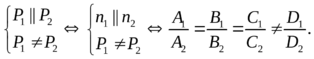 1) Плоскости параллельны (но не совпадают). В этом случае векторы нормалей должны быть коллинеарны: