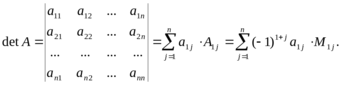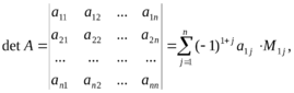 Определение Определителем n-го порядка (определителем квадратной матрицы n-го порядка n), n>1, называется число, равное сумме произведений элементов первой строки на их алгебраические дополнения: