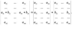Если квадратные матрицы A, B и С отличаются только i-й строкой и при этом i-я строка а матрицы С равна сумме соответственных элементов i-х строк матриц A и B, то detC=detA + detB: