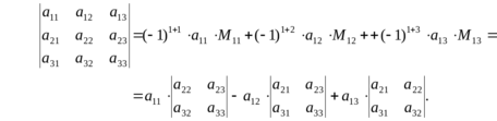 Теорема о вычислении определителя разложением по любой строке (столбцу). Определитель n-го порядка, n>1, равен сумме произведений элементов любой строки (столбца) на их алгебраические дополнения.