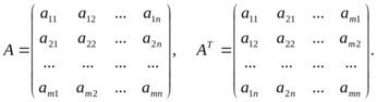 Определение. Рассмотрим произвольную прямоугольную матрицу A. Матрица, получающаяся из матрицы A заменой строк столбцами, называется транспонированной по отношению к матрицеA и обозначается AT:
