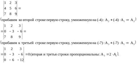 Если в определителе есть две пропорциональные строки, то он равен нулю.