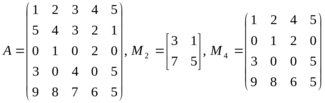 минор M2 расположен на пересечении 2-й и 5-й строк с 3-м и 5-м столбцами, а минор M4 — на пересечении 1-й, 3-й, 4-й и 5-й строк с 1-м, 2-м, 4-м и 5-м столбцами.
