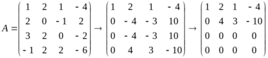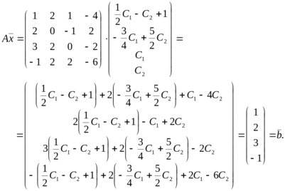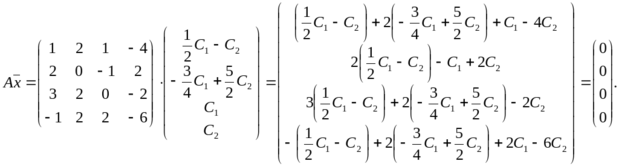 Ранг матрицы системы равен r = 2, число неизвестных n =4, r < n — система нетривиально совместна. Кроме того, очевидно, множества решений исходной системы и системы с преобразованной матрицей совпадают.
