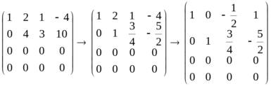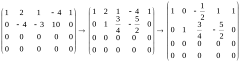 Продолжим преобразование матрицы системы, выполняя элементарные операции со строками так, чтобы базисный минор матрицы стал единичным (обратный ход метода Гаусса):