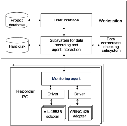 Stationary monitoring solution for integration/testing bench. In 2009, a testbench for integration and testing of aircraft RTA systems was created and accepted for operation. This testbench includes several instrumental computers equipped with MIL STD-1553B and ARINC 429 adapters, and workstations. Instrumental computers perform functional and integration testing activities under control from workstations, generating test data traffic and checking responses from RTA system devices. Instrumental computers are also capable of running simulation models of unavailable RTA system devices. Monitoring toolset's resident modules are installed on all instrumental computers, and onboard interface adapters are shared between testing and monitoring tools. Monitoring tools can be used either as a source of information on data exchange between RTA system devices and instrumental computers (e.g. for test or model debugging purposes), or as a standalone facility for generation of simple traffic for RTA system devices in course of development of devices' source code. In both cases, the online monitoring functions are mostly used. The testbench is connected to a server which hosts the project database to enable automatic import of data from the database.