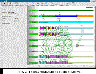 Процесс моделирования может осуществляться в течение любого заданного инженером-экспериментатором времени. В ходе моделирования выполняется оперативное отображение значений выбранных переменных в составе моделей, также возможна оперативная модификация этих значений пользователем. Анализ результатов происходит в режиме постанализа. В процессе моделирования вся необходимая информация накапливается в массиве – трассе событий. После завершения модельного эксперимента трасса визуализируется в виде набора временных диаграмм (рис. 2), каждая из которых соответствует одной из использованных моделей (системы, прибора, канала обмена и т.п.). На рис.2 представлены диаграммы для модели движения, ИНС, приборов из состава ЦВК КО и т.д. На диаграммах отображаются произошедшие в процессе моделирования события и состояния (решение задач, передача или прием информации и т.п.). Стрелки указывают на связи между событиями в модели при информационных обменах. Визуализатор временнóй диаграммы поддерживает анализ результатов моделирования, предоставляя функции поиска и выборочного отображения (фильтрации) событий и состояний; в частности поддерживается поиск событий обмена по МКИО с учетом специфических для стандарта МКИО признаков (адреса отправителя и получателя, формат обмена и т.д.).