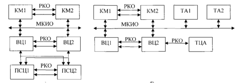 В рамках совместного проекта МГУ имени М.В. Ломоносова и ЦНИИ «Электроприбор» была проведена апробация и адаптация программной среды ДИАНА для БВС морских навигационных комплексов. При этом были рассмотрены фрагменты двух БВС, структурные схемы которых в упрощенном виде представлены на рис.4. В состав первого фрагмента входили приборы контроллеров МКИО (КМ1 и КМ2), вычислительные приборы комплексной обработки (ВЦ1 и ВЦ2) и приборы связи с потребителями (ПСЦ1 и ПСЦ2). Экземпляры одноименных приборов обменивались информацией по радиальным каналам (РКО). Состав и конфигурация второго фрагмента были несколько иными. В нем отсутствовали приборы связи, но при этом появились три трансляционных прибора (ТЦА, ТА1 и ТА2).