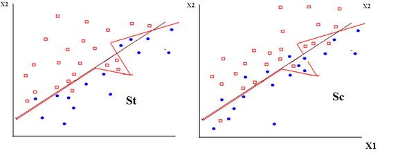 На левой части показано, что использование кусочно-линейной границы (красная линия)позволяет значительно лучше разделить объекты класса K1