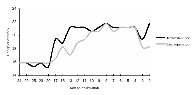 является естественным следствием набора факторов (неидеальность процедур вычисления предикатов Pt(S), малая длина выборок, "частичная несогласованность" выборок, когда информативность признака на обучающей таблице и контрольной имеет некоторое различие). Из рисунка следуют естественные качественные выводы о данной задаче распознавания. Удаление первой трети малоинформативных признаков мало влияет на точность распознавания и не зависит от используемого метода их сокращения - оставшиеся 20 признаков вполне компенсируют отсутствие остальных 14. При удаление последующих 10 потери при кластеризационной минимизации растут меньше, чем при частотной.