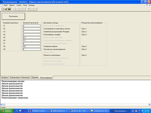 Окно состоит из двух частей. В нижнюю часть выводятся различные сообщения, которые возникают при работе методов, а в верхней находятся управляющие закладки. Для данного типа проекта можно загрузить только выборку для обучения. Распознавание в таком проекте производится для конкретного объекта, который задается вручную. Оценивание точности распознавания каждым алгоритмом осуществляется автоматически по обучающим данным. Опишем управляющие закладки данного проекта.