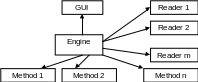 Вся система разбита на модули, которые реализуют разработанный и жестко зафиксированный интерфейс. Основным модулем программы является Engine, отвечающий за управление всеми процессами, происходящими в системе, и связь между модулями. Вторым важным модулем является GUI (graphical user interface), который отвечает за графический интерфейс пользователя, то есть меню, панели инструментов, графическое представление данных и результатов работы методов. Завершают список группа однотипных модулей обработки данных, реализующих различные математические методы распознавания и кластеризации, и группа модулей загрузки данных. Общая структура системы представлена на рисунке 55.
