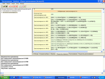 При обучении тестового алгоритма дополнительно выводится найденный список опорных множеств с оценками их информативности (рис.49).