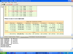 Результаты скользящего контроля (если активизирована соответствующая опция) выводятся в виде таблицы результатов распознавания (классификации) элементов таблицы обучения (номер объекта, результат его классификации, оценки за классы, номер истинного класса объекта, см. рис. 47) и общей сводки по классификации (рис. 48).