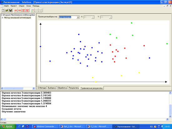 Управление методом кластеризации осуществляется по тому же принципу, что и методом распознавания. Отличие заключается в следующем. В случае кластеризации мы имеем не 6, а 5 управляющих закладок. Первые четыре из них аналогичны первым четырем закладкам метода распознавания. На пятой же закладке представлены результаты кластеризации в графическом виде в соответствии с результатами работы метода (см. рис. 39):