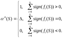 То есть объект относится в первый класс, если более половины функций положительны и во второй класс, если более половины функций отрицательны. В противном случае происходит отказ от распознавания.