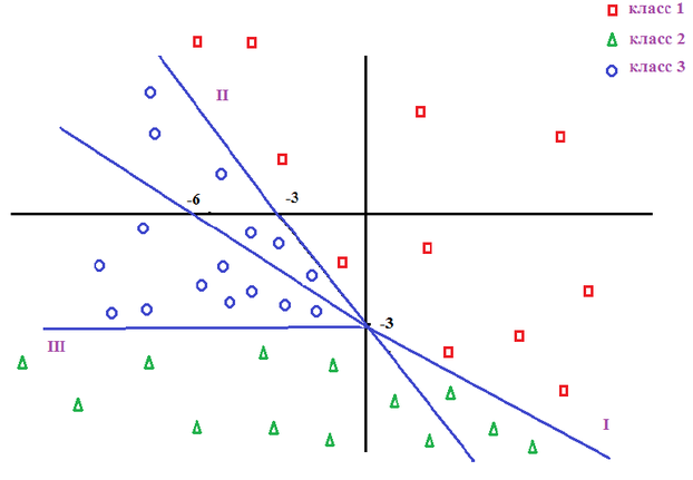 Приведём графический пример алгоритма распознавания, построенного с помощью метода линейная машина. Имеется задача распознавания с классами 1, 2, 3 по признакам