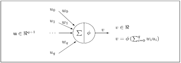 В основе нейросетевых методов лежит попытка компьютерного моделирования процессов обучения, используемых в живых организмах. Когнитивные способности живых существ связаны с функционированием сетей связанных между собой биологических нейронов – клеток нервной системы. Для моделирования биологических нейросетей используются сети, узлами которых являются искусственные нейроны (т.е. математические модели нейронов), Можно выделить три типа искусственных нейронов: нейроны-рецепторы, внутренние нейроны и реагирующие нейроны. Каждый внутренний или реагирующий нейрон имеет множество входных связей, по которым поступают сигналы от рецепторов или других внутренних нейронов. Пример модели внутреннего или реагирующего нейрона представлен на рисунке 1.